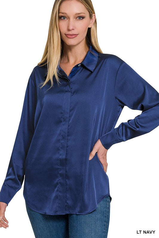 Visit uncharted style waters in this navy satin shirt! Featuring a collared neckline, concealed buttons, and an U Hem, you'll be soaring through the fashion galaxy in no time. Look good and feel great as you explore all the amazing places life has to offer!