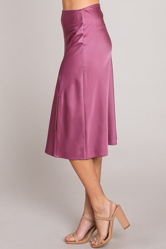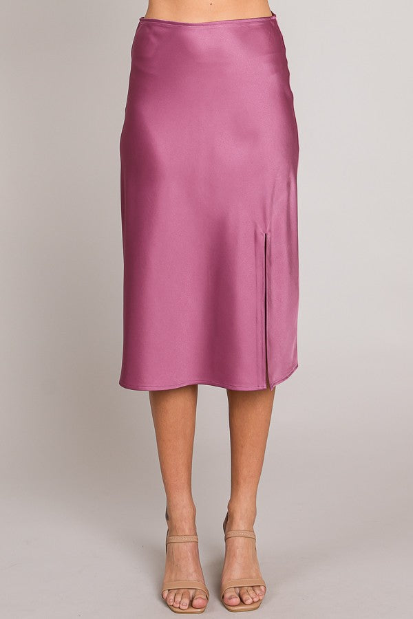 Satin Front Slit Midi Skirt - Fabric is Slightly Stretchy - Elastic Stretch Waistband, for Fit - Junior & Young Contemporary Fit