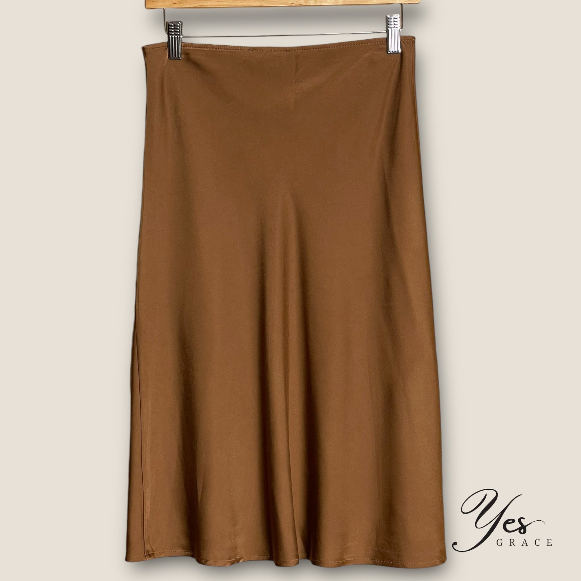 Alexis | Satin Front Slit Midi Skirt | Cafe