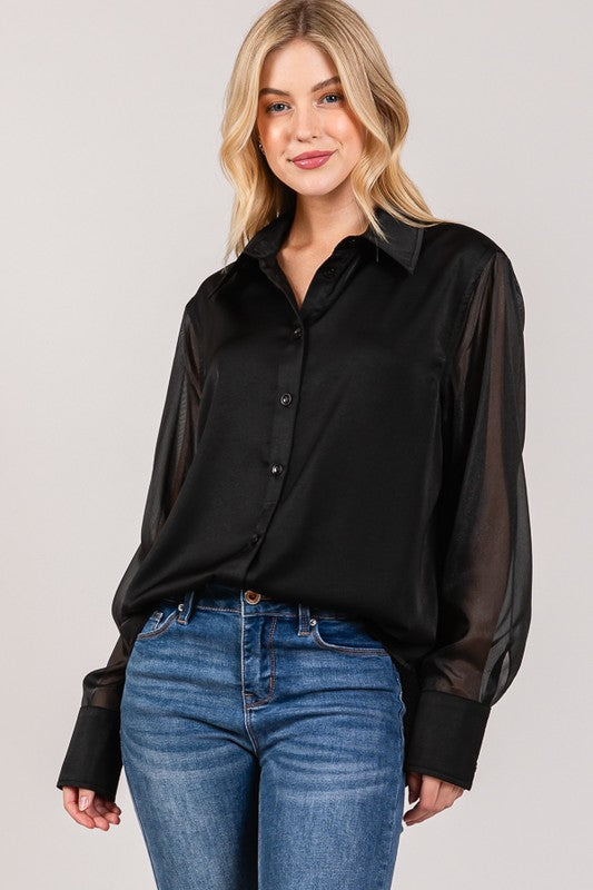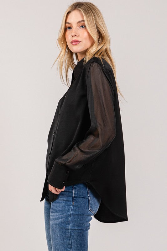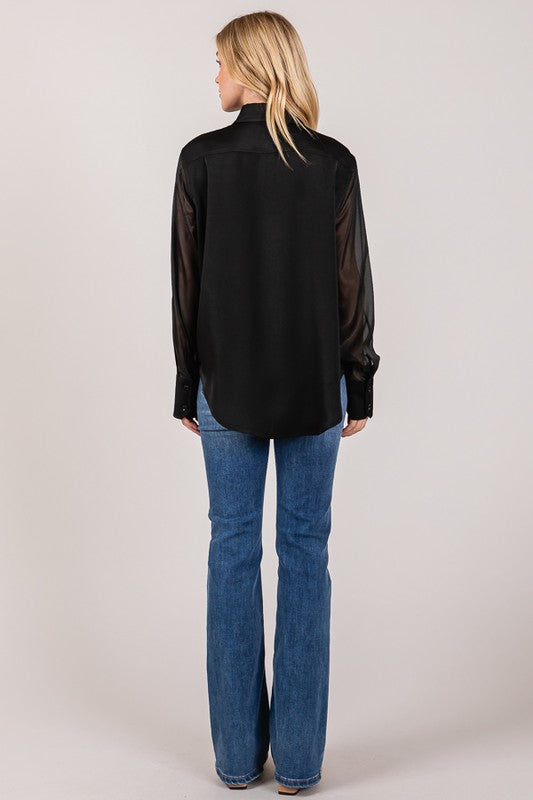 Satin Organza Contrast Sheer Dress Shirt | Black