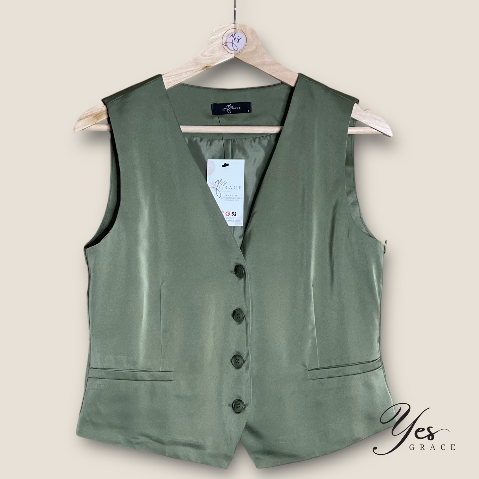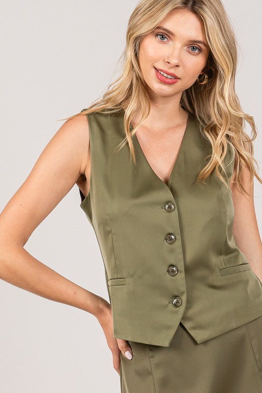 Satin Tailored Vest - Fabric is Slightly Stretchy. - Crepe Fabric Lining - Fake Welt Pockets - Junior & Young Contemporary Fit -