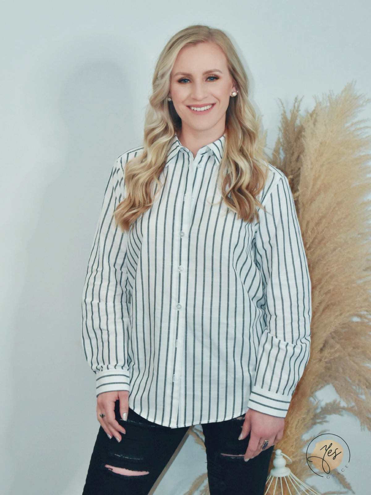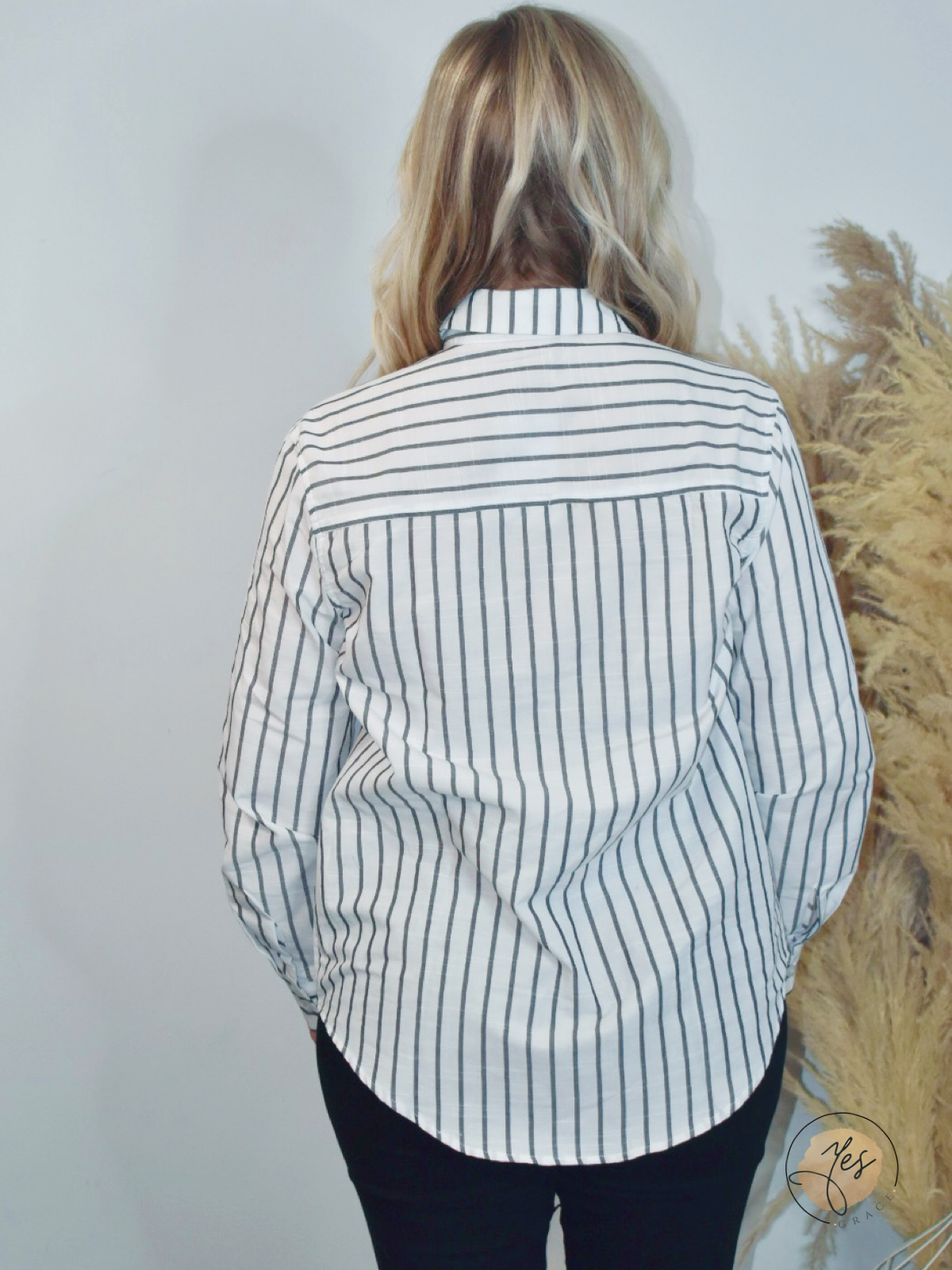 For those days when you want to up your style game, it's time to Pencil Me In. This fun striped button down shirt brings a playful take on a classic, with a pointed collar and front buttons to keep things professional. The long sleeves and buttoned cuffs let you dress it up or down - gotta love options! Don't worry - you won't get too stripey, thanks to the back yoke. #Winning!
